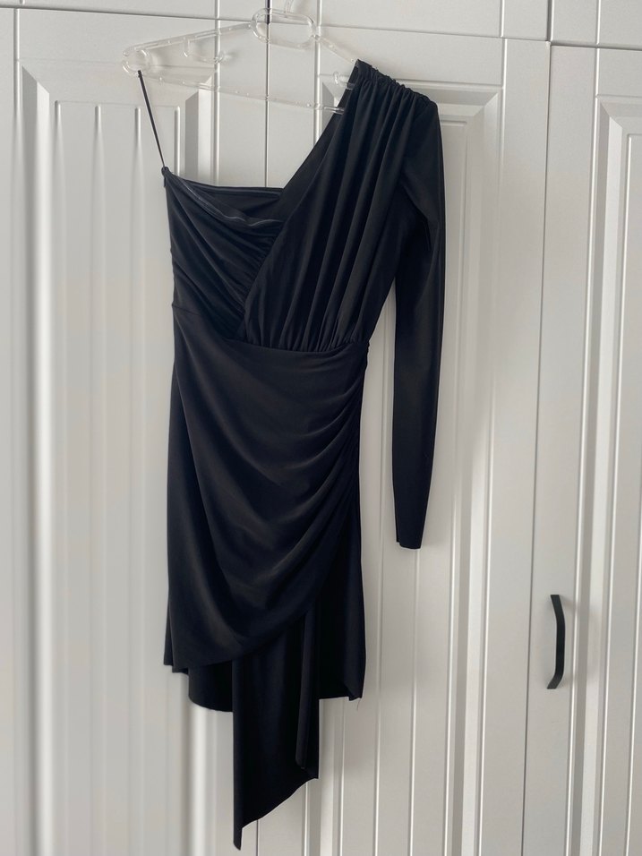 Bu siyah elbise, tek kollu ve askısız bir yanın birleşimiyle asimetrik ve drapeli, fit kesimlidir.