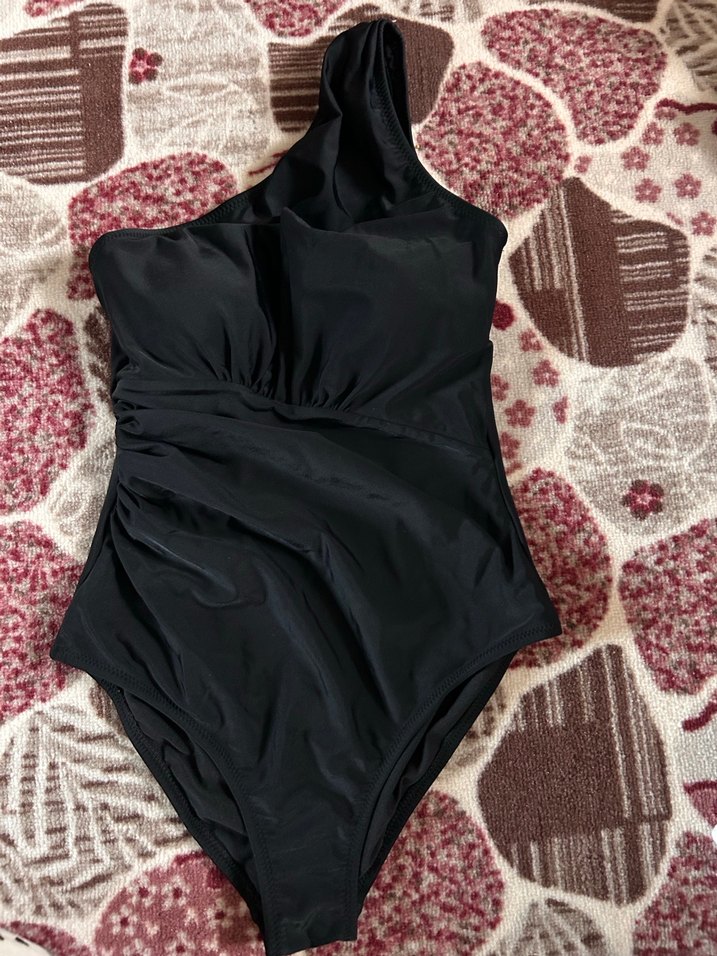 Siyah, drapeli ve tek omuzlu, kolsuz, midi uzunlukta, cesur bir plaj görünümü için tasarlanmış dar kesim mayo ️.
