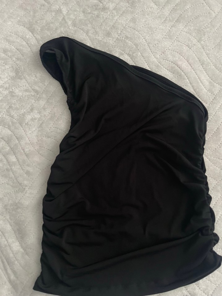 Siyah, drapeli ve tek omuzlu olan bu dar kesim monokini, midi boyda ve desensizdir. Cesur ve minimalist tarzda günlük kullanıma uygundur.