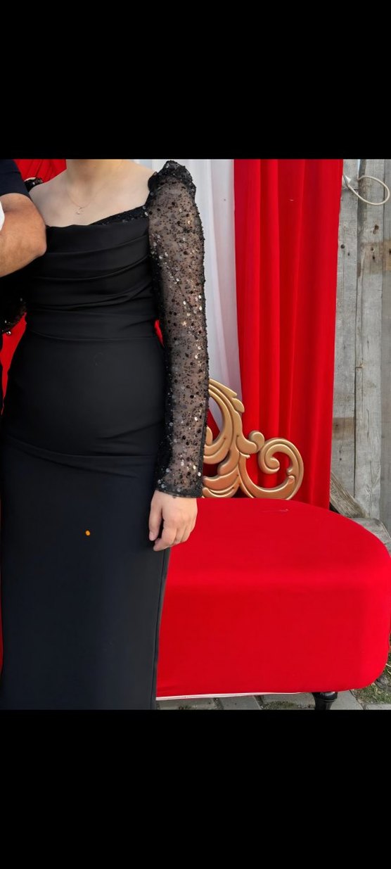 Bu siyah dar kesim abiye elbise, drapeli tasarımı ve tek kolunda siyah payet detaylı uzun kolu ile şık bir görünüm sunar. Uzun boyu ve desenli koluyla düğünler için uygundur. ✨