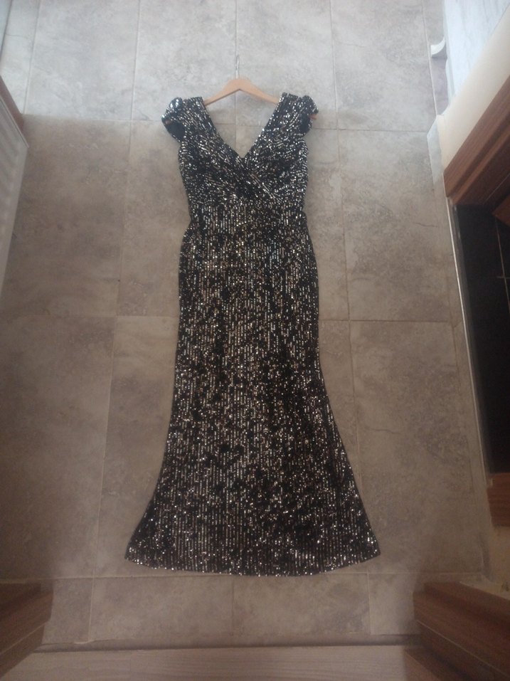 Siyah uzun abiye elbise, drapeli ve v yaka kesime sahiptir. Kolsuz ve desenlidir, düğünler ve özel davetler için uygundur. arka kısmında birkat tane pul düşmüş belli bile değil