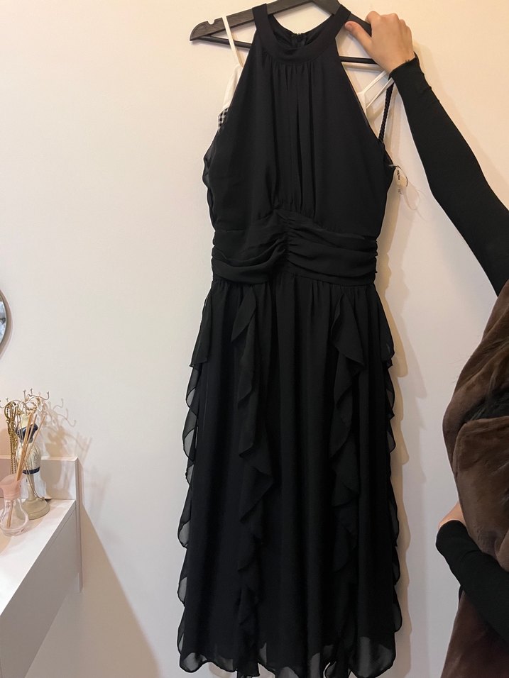 Yüksek yakalı, askılı ve drapeli detaylara sahip siyah, s-m uyumludur hiç giyilmedi