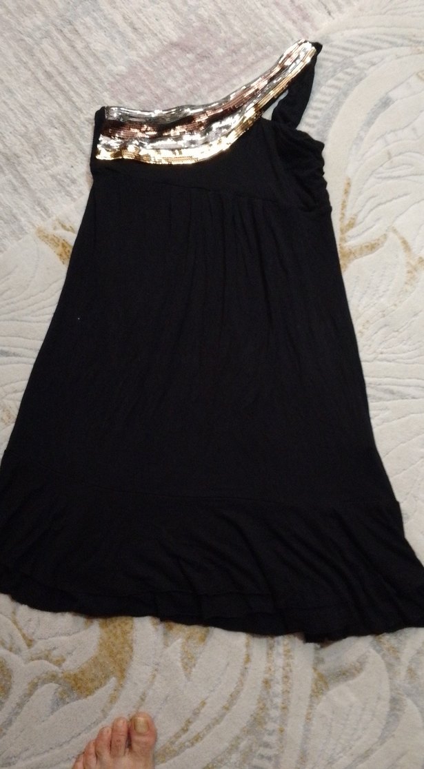 Siyah uzun abiye elbise, drapeli ve kolsuz, kayık yaka ve bol kesimiyle parti için uygundur.