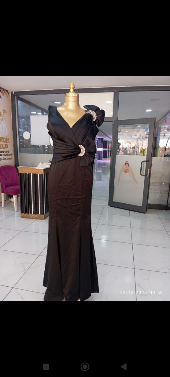 Siyah uzun abiye elbise, drapeli tasarımı ve V yakası ile klasik ve şık bir görünüm sunar. Kolsuz ve düzenli kesimdir, düğünler için uygundur. ✨