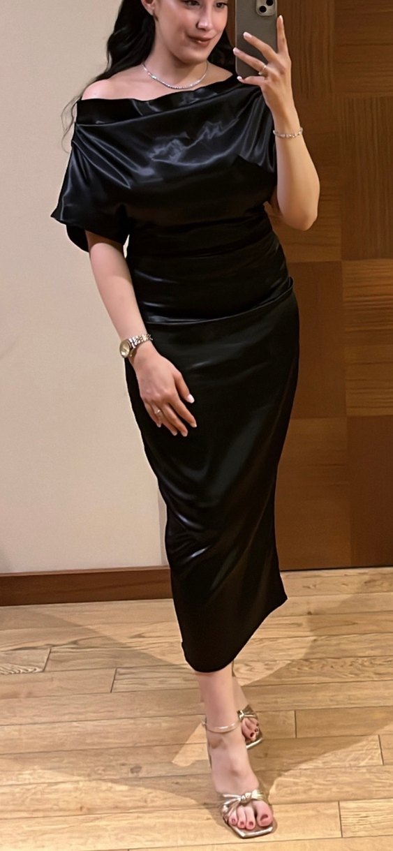 Drapeli ve kayık yaka detaylı, siyah uzun, vücuda oturan abiye elbise, romantik akşamlar için uygun. 1 kez giydim