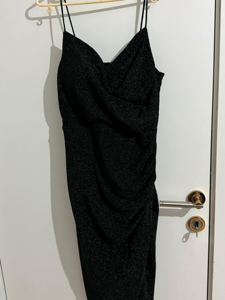 Bu siyah, drapeli, uzun abiye elbise, V yakalı ve kolsuz olup, cesur ve gösterişli bir görünüm sunar. 1 kere giydik kizlar ve icinden silikonu vardir