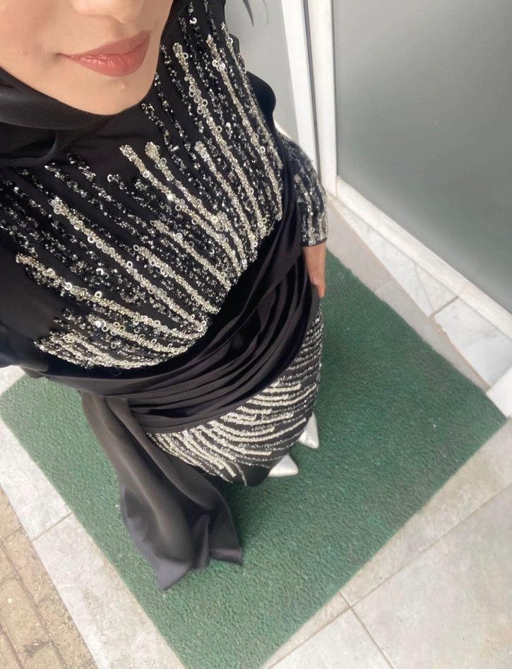 Siyah uzun abiye elbise, drapeli ve vücuda oturan kesimiyle yüksek yakalıdır. Desenli tasarımı ve askılı kollarıyla çağdaş ve avangart tarzı bir araya getirir. ✨