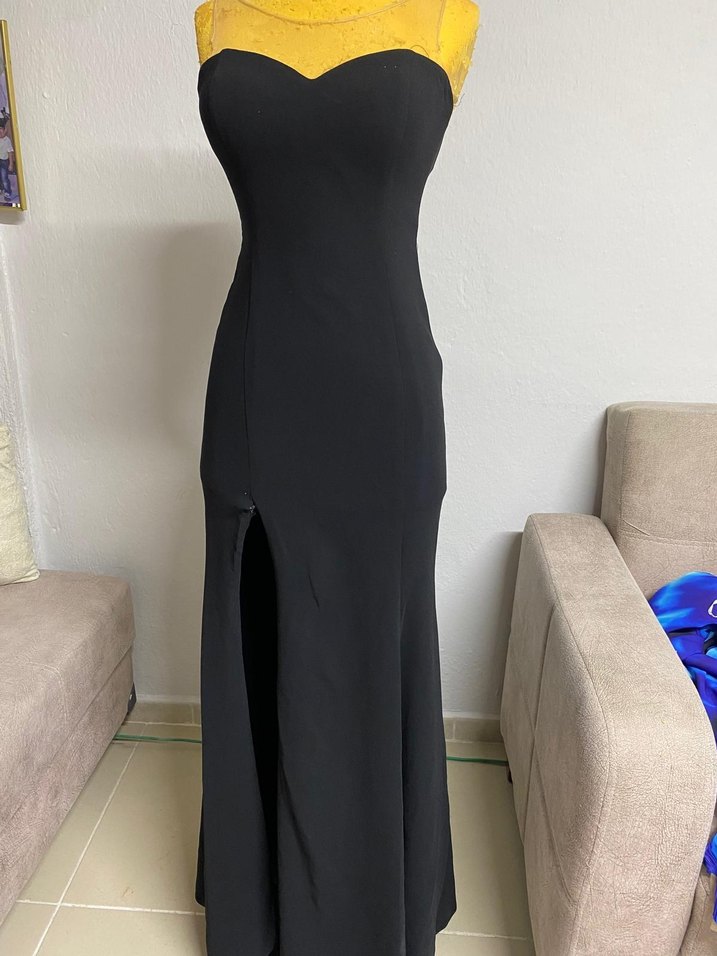 Siyah, dar kesim uzun abiye elbise, V yaka ve ince askılı, drapeli detaylarla modern parti stili sunar. ✨