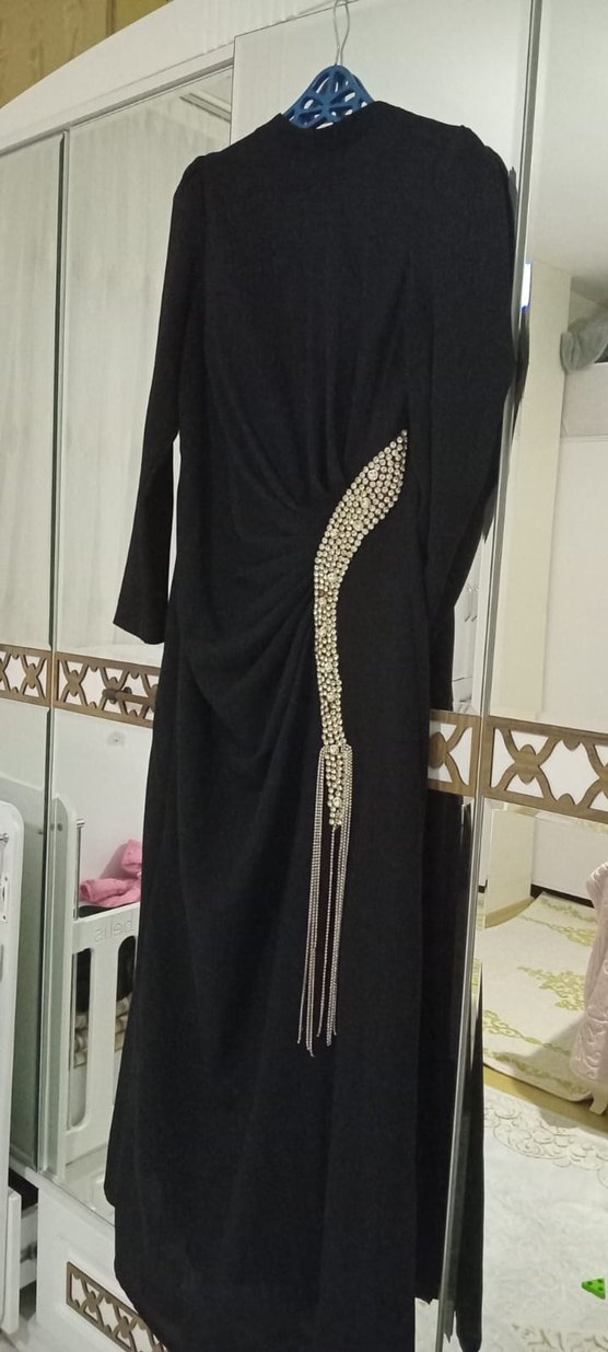 Siyah, drapeli ve dar kesim uzun abiye elbise, askılı kollu ve yuvarlak yakalı. Abiye taş ve püskül detaylarıyla gelinlik için uygun. ✨
