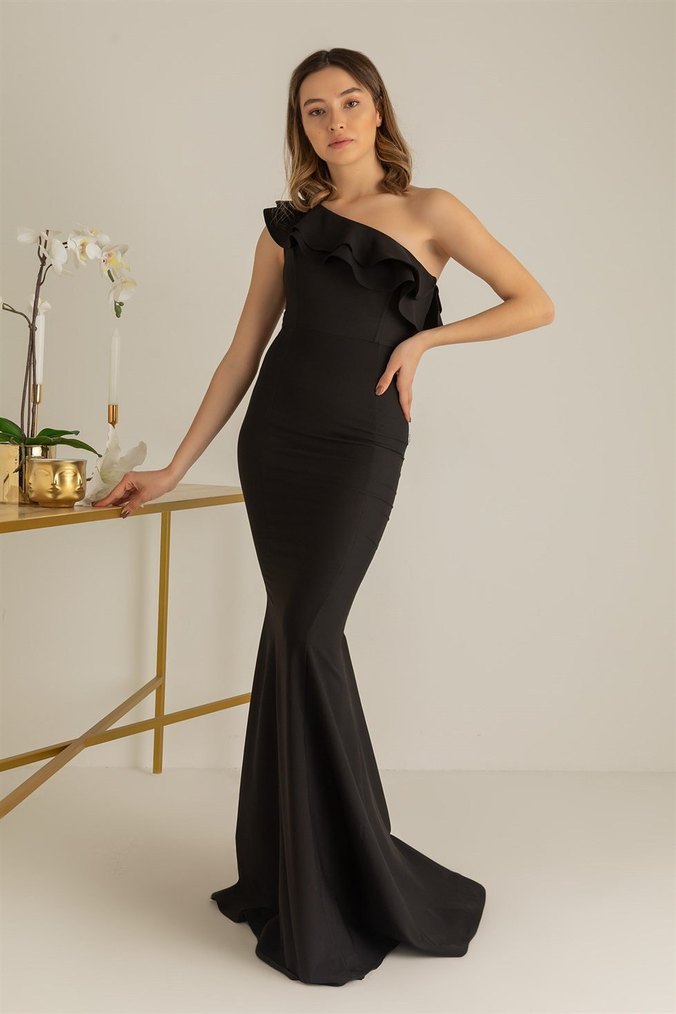Siyah Drapeli Uzun Abiye Elbise