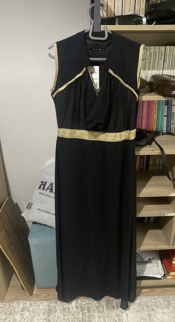 V yaka, kolsuz, drapeli detaylı, altın renkli kemerli siyah uzun elbise. Modern klasik tarzda şık bir seçim. ✨
