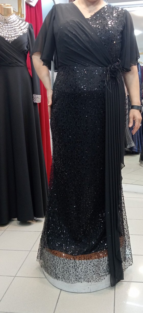 Siyah uzun abiye elbise, straplez yaka ve drapeli tasarıma sahiptir. Desenli payet detayları ve askılı kollarıyla gösterişli parti davetleri için uygundur. ✨