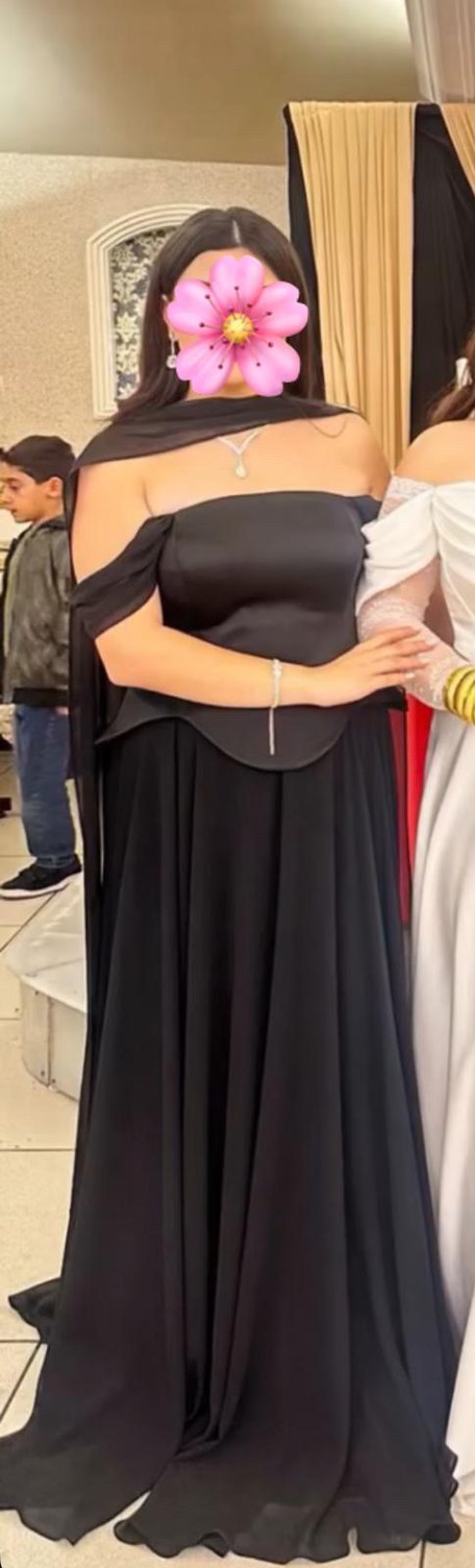 Siyah, drapeli ve askılı kolları olan uzun, vücuda oturan abiye elbise. Tek renk ve tek parça tasarım, şık düğünler için uygundur.