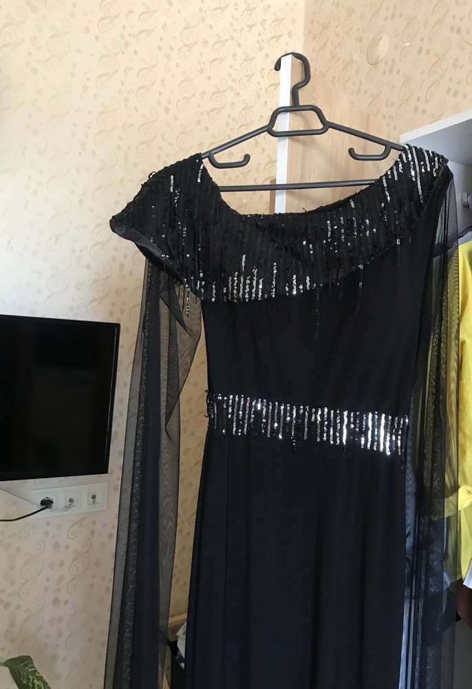 Siyah uzun abiye elbise, drapeli detaylar ve askılı kol tasarımıyla fitted kesime sahiptir. Straplez yaka ve baskılı deseniyle gotik parti stiline uygundur. UZUNLUĞU 140 CM #geceelbisesi #abiye #düğünelbise