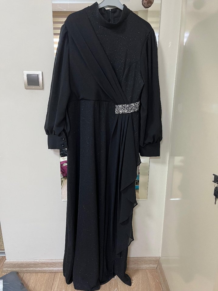 Siyah uzun abiye elbise, drapeli tasarım, yüksek yakalı ve uzun kollu. Düzenli kesim, desenli kumaş, mütevazı ve gösterişli tarz için uygun. ✨