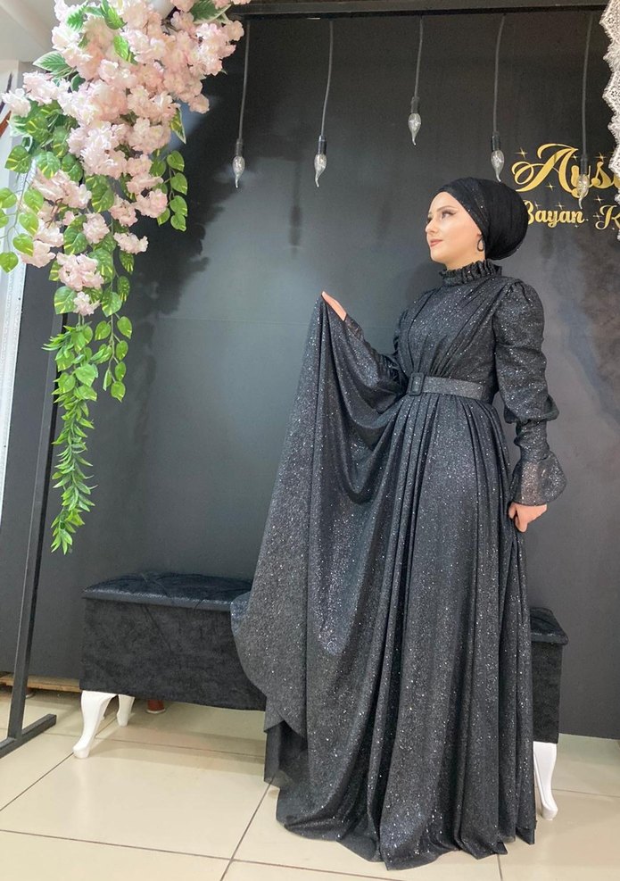 Siyah, uzun kollu, yüksek yakalı ve bol kesimli bu abiye elbise, drapeli tasarımı ve gri desenlerle zarif bir görünüm sunar. Düğünler için uygundur. şalıda mevcuttur✨