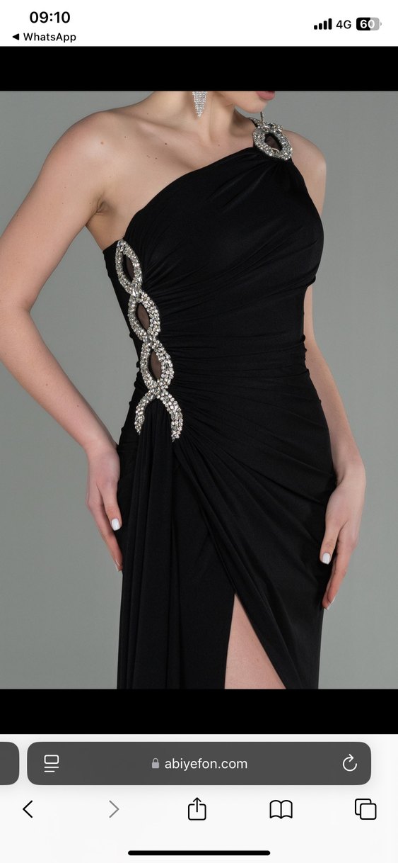 Siyah, drapeli, yan kısmı taşlı süslemeli, uzun ve dar kesim abiye elbise. Etiket 40 beden ama ben 38 beden giyiyorum ve bana 40 oldu