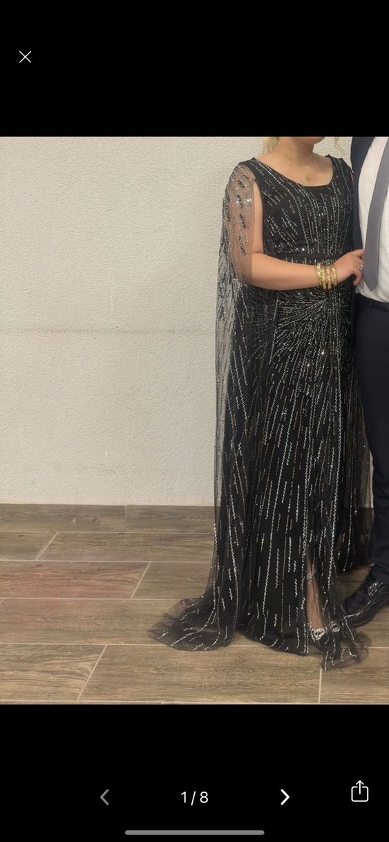 Siyah renkli, drapeli ve desenli uzun abiye elbise. Vücuda oturan kesimi, tekne yaka ve ince askılı kollarıyla şıklık sunar. Düğünler için uygundur. ✨