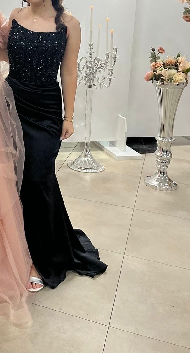 Siyah, drapeli ve vücuda oturan uzun abiye elbise, tekne yaka ve ince askılı kollara sahiptir. Modern ve şık bir düğün kıyafeti.