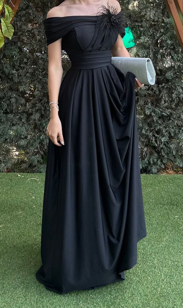 Siyah, askısız ve drapeli tasarıma sahip uzun abiye elbise, normal kesim ve kolsuzdur. Düğünler için klasik ve gotik şıklık sunar. Bir kere giyilmiştir.