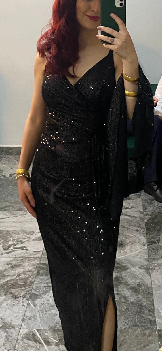 Drapeli, V yaka ve askılı, desenli siyah uzun abiye elbise. Gösterişli ve klasik şıklık sunar. Boyum 1.50 bana tam oluyo benden uzunsanız olmaz.