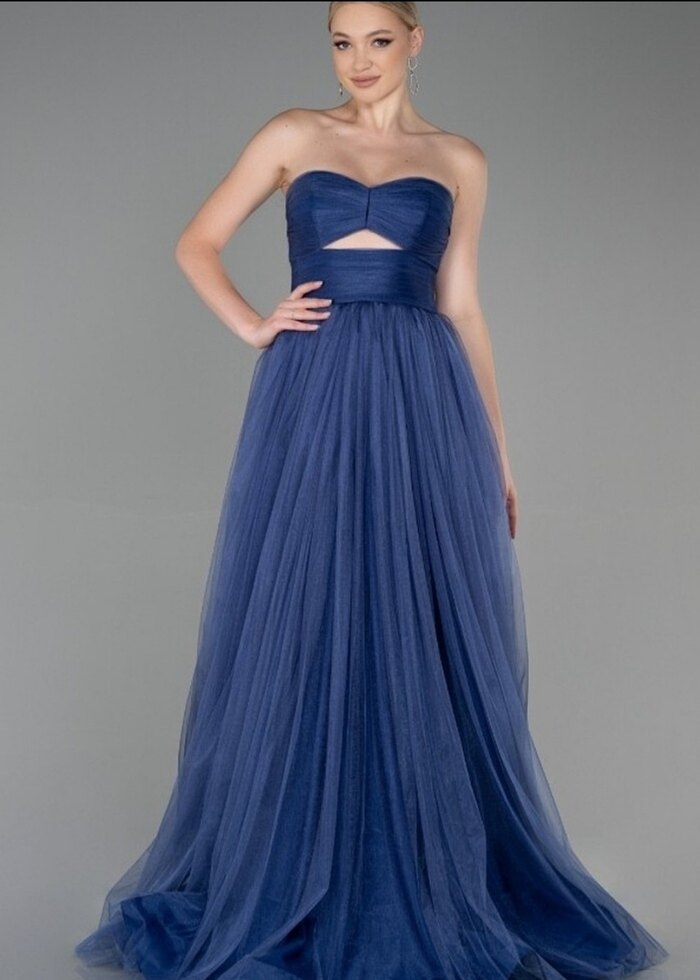 siyah renkte, drapeli ve straplez kesime sahip uzun abiye elbise. İnce askılı, fit kesimli ve çağdaş tarzda, düğün için uygun bir model.
