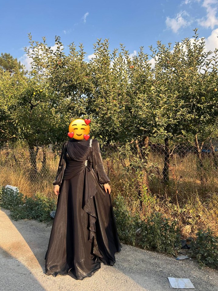 Siyah renkte, yüksek yakalı ve uzun kollu, bol kesim drapeli uzun abiye elbisedir. mütevazı ve özel davetlere uygundur.