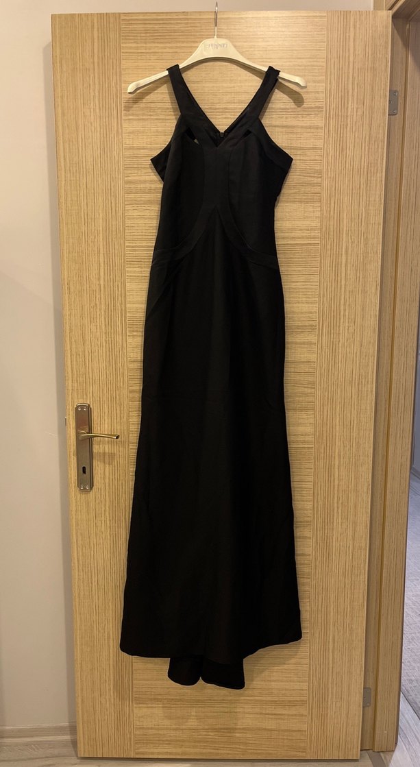 Siyah renkte, drapeli tasarıma sahip uzun abiye elbise. V yaka ve ince askılı, düzenli kesim ile düğün ve özel günler için uygundur.