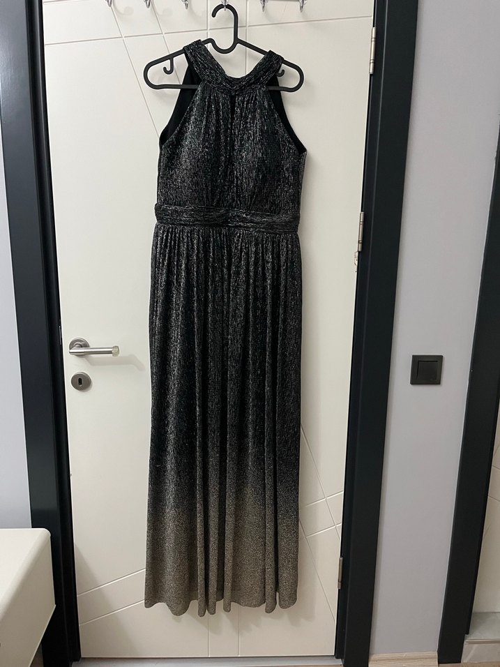 Siyah, drapeli ve bağlamalı desenli uzun abiye elbise, yüksek yakalı ve kolsuz tasarıma sahip, klasik şıklık için ideal.