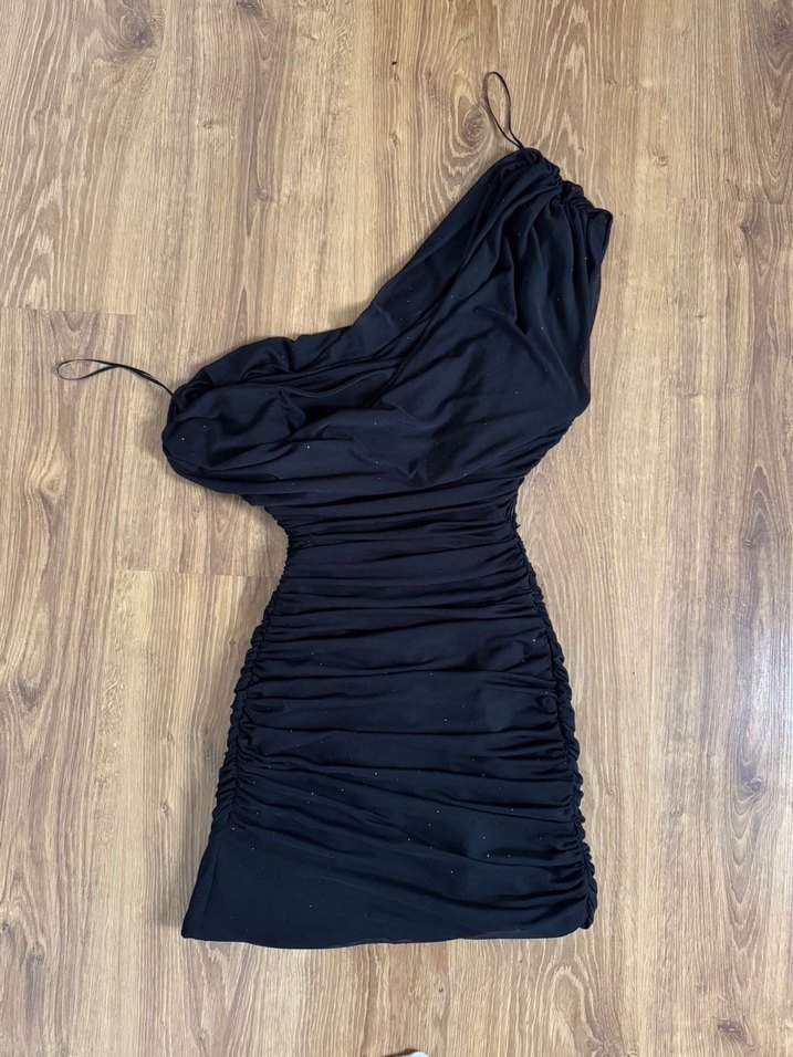 Drapeli tasarımı, V yaka ve tek askılı uzun siyah abiye elbise, parti için şık ve göz alıcı.
