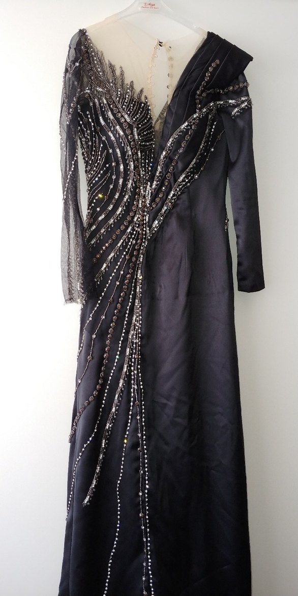 V yaka ve uzun kollu, drapeli boncuk işlemeli desenli siyah uzun abiye, avant-garde parti tarzı için uygun.