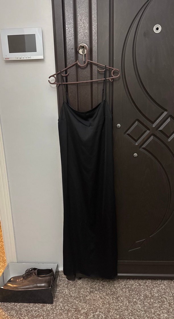 Siyah, drapeli, askılı, uzun ve vücuda oturan elbise. İpek gibi kumaştan, halter yaka ve minimalist gotik tarzda.