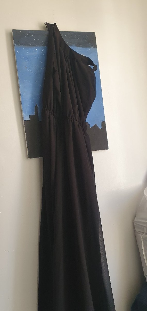 Siyah, drapeli ve askılı uzun elbise, straplez yakalı ve yumuşak dokulu kumaştan. Salaş kesimiyle minimalist gotik tarzda parti için uygun. sadece bir kere giyildi fotoğrafta rengi falan kötü çıkmış canlı bir siyah rengi her yer için uygun