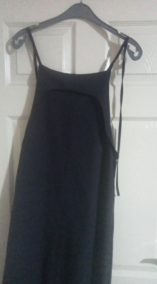 Siyah, drapeli detaylara sahip uzun, askılı ve halter yaka elbise. Minimalist ve gotik tarzda, romantik gece için uygun.