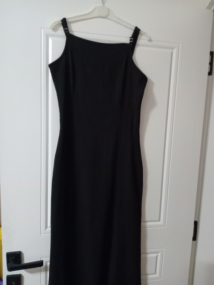 Siyah, askılı ve drapeli tasarıma sahip uzun elbise. Sentetik kumaştan, düzenli kesim, ofis kullanımı için uygun klasik ve minimalist tarzda.