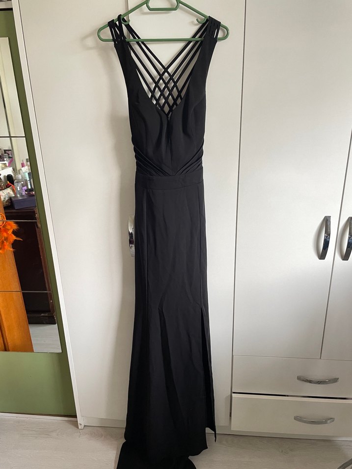 Bu siyah, uzun ve dar kesim gece elbisesi V yakalı ve askılı sırt detaylarına sahiptir. Hiçbir sorunu yoktur düğünler için idealdir.