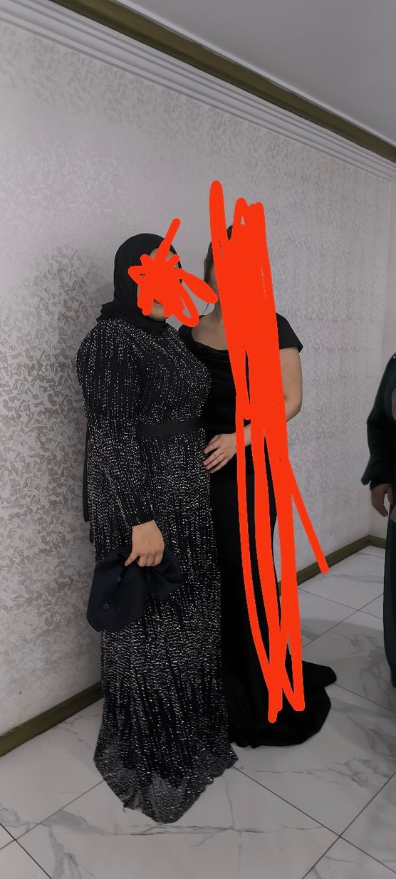 Drapeli desenli, askılı kollu ve halter yakalı siyah, vücuda oturan uzun abiye elbise. Gotik tarzda parti için uygun. 89 kiloyum Bir defa düğünde giyildi