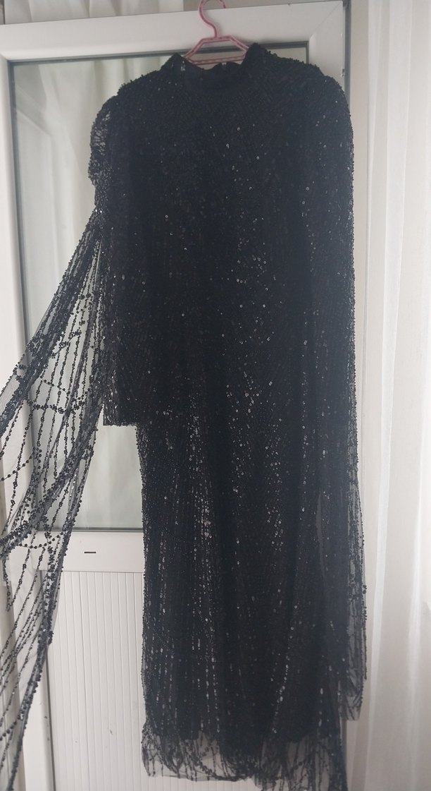 Bu dar kesim uzun abiye elbise, drapeli tasarımı, ince askıları ve kayık yaka detayıyla dikkat çeker. Koyu siyah rengi ve gotik tarzı parti için uygundur.