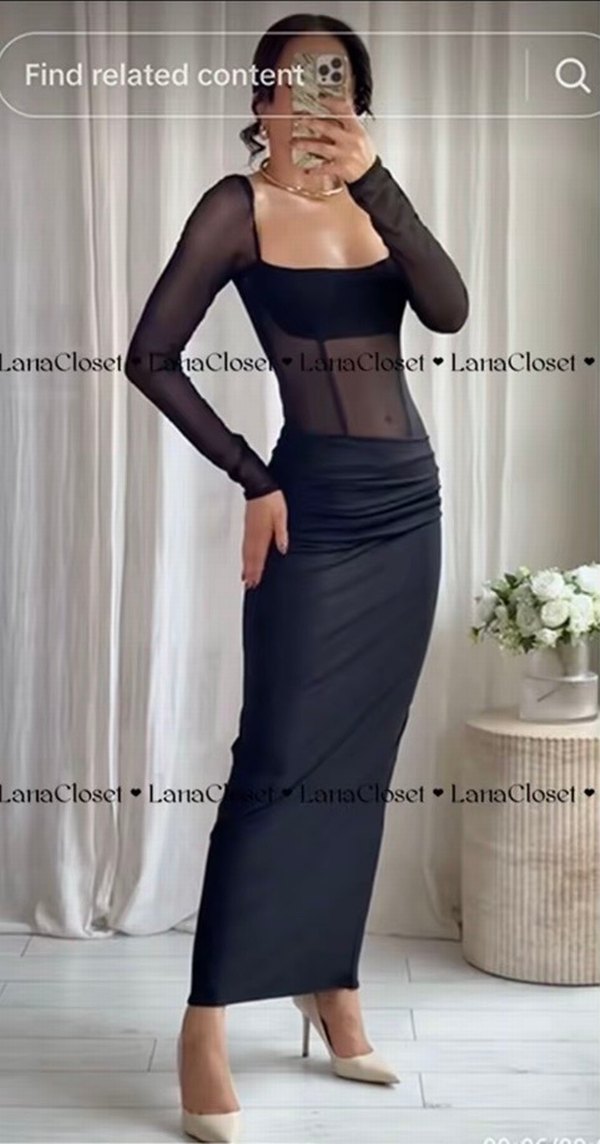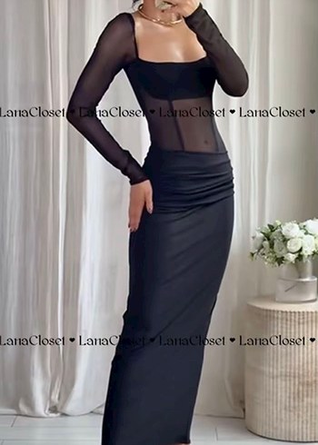 Uzun siyah elbise, tekne yaka ve ince askılı uzun tül kollarla tasarlanmıştır. Bel kısmında drapeli detay bulunur, yumuşak sentetik kumaştan yapılmıştır, gotik tarzı yansıtır.