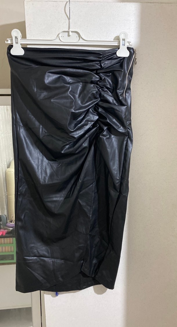 Siyah sentetik kumaştan drapeli, dar kesim uzun etek. Gotik tarzıyla parti için uygun.