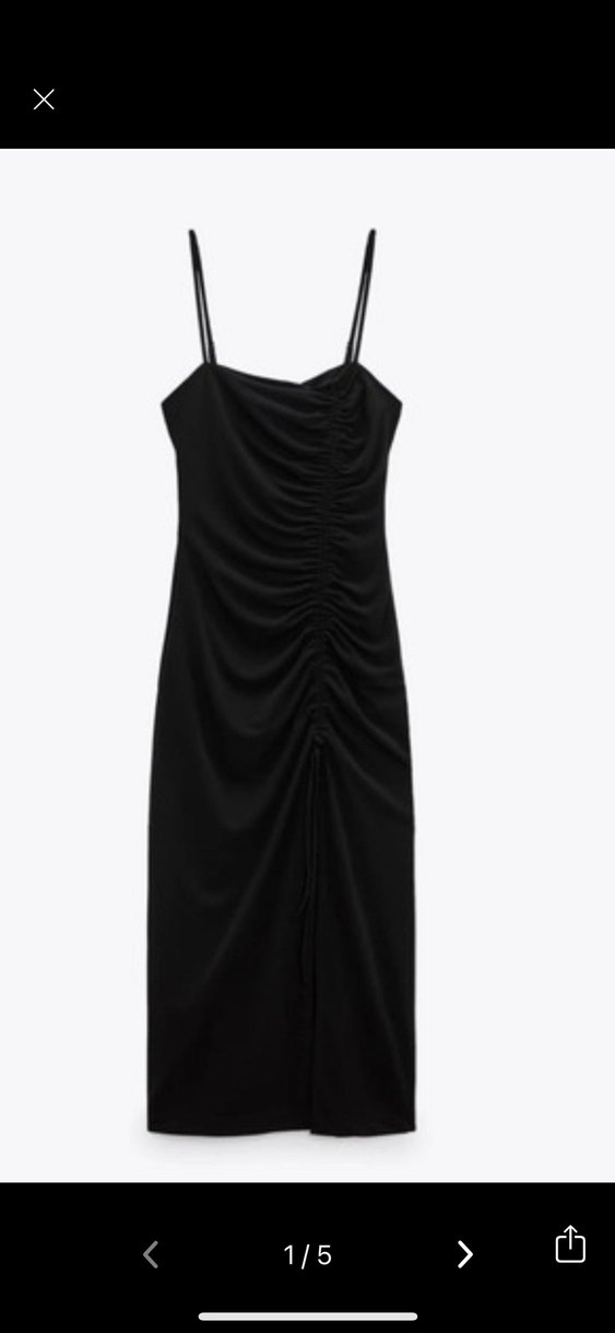 Siyah uzun ip askılı, drapeli ve straplez yaka tasarıma sahip, vücuda oturan elbise. Pürüzsüz sentetik kumaştan yapılmıştır, romantik akşamlar için minimal gotik stil sunar.