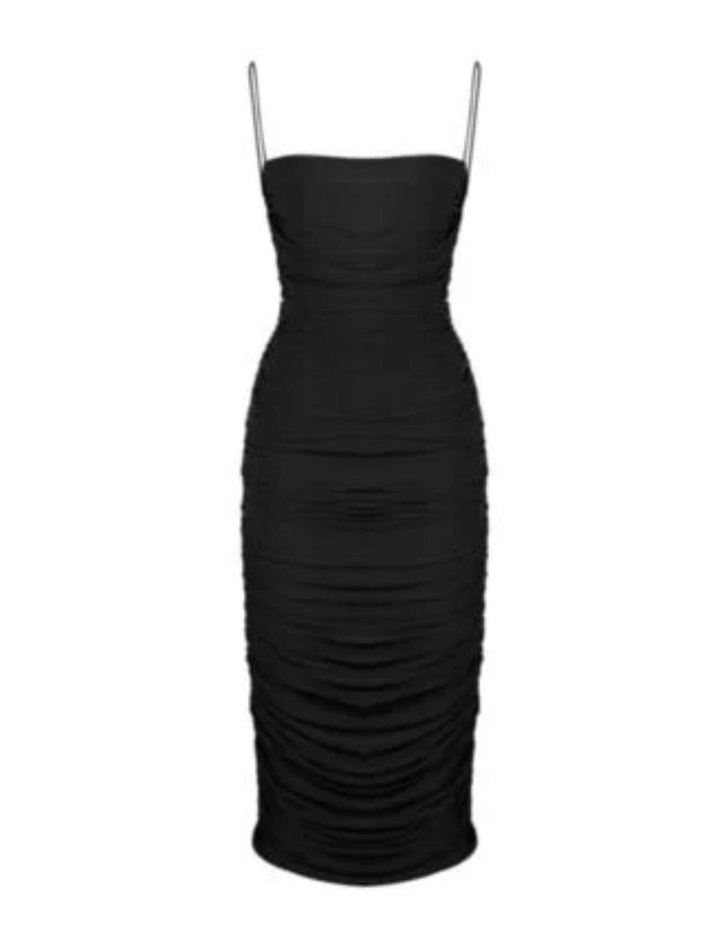 Siyah, drapeli ve uzun kesimli bu kadın elbisesi, tekne yaka ve ince ip askılarıyla cesur, minimalist gotik tarzını yansıtıyor.
