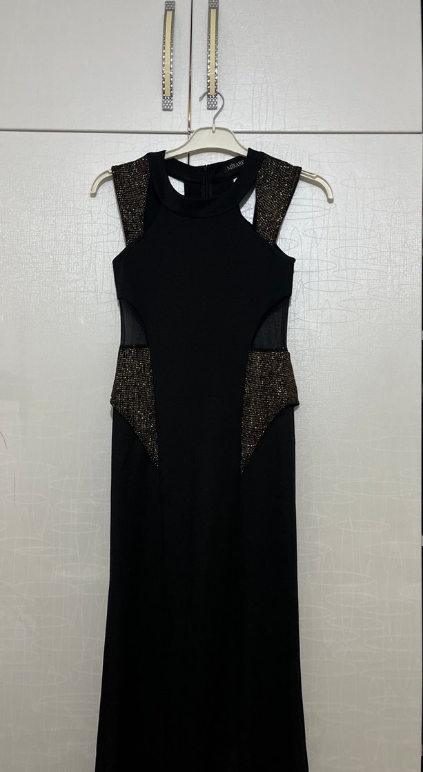 Siyah, drapeli detaylara sahip, yüksek yakalı ve kolsuz, vücuda oturan uzun abiye elbise, avant-garde tarz partiler için uygun. Sadece bir kez giyildi