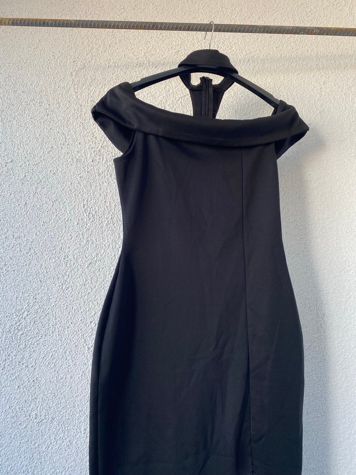 Siyah, drapeli, uzun ve vücuda oturan kesimiyle minimalist goth tarzına uygun kadın abiye elbise.