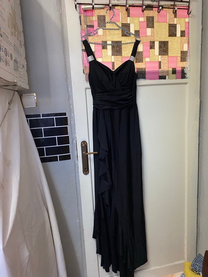 Bu siyah uzun abiye elbise, straplez yaka ve drapeli detaylara sahip, ince askılı, klasik ve gotik Paris tarzını yansıtan şık bir modeldir. 1 kez giyildi sorunsuzdur. Yırtmaçlı ve fermuarlıdır. Bedeni güzel saran esnek yapısı vardır.