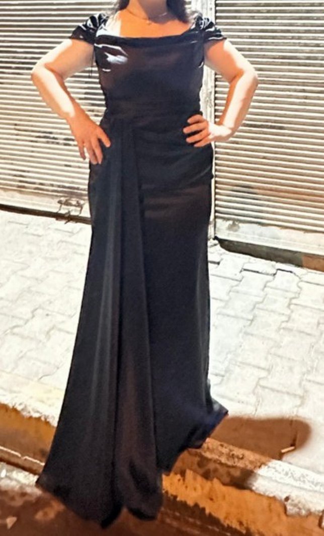 Siyah uzun abiye elbise, tekne yaka ve ince askılı, drapeli detaylı, düzenli kesimle düğünler için uygun. ✨ ve çok şık kuzenimin düğününde giydim ve herkes çok sordu çok beğendi