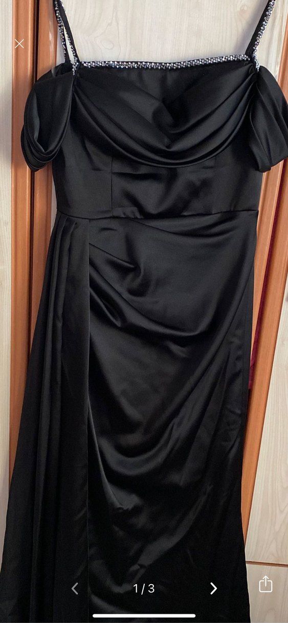 Bu siyah abiye elbise, drapeli tasarımı, kayık yakası ve ince askıları ile gotik tarz sunar. Parti için uygundur.