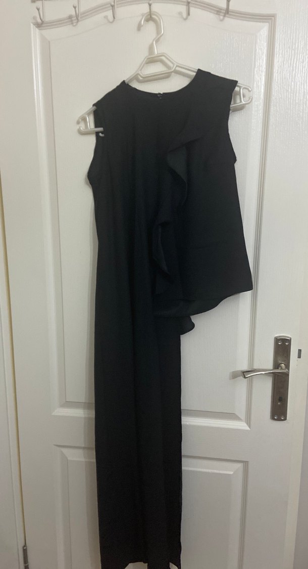 Siyah renkte, kolsuz, yüksek yakalı ve drapeli tasarıma sahip uzun abiye elbisedir. Minimalist ve gotik tarzda, ofis için uygundur.