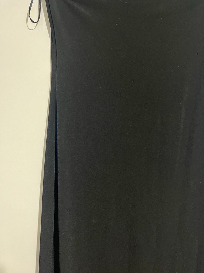 Siyah uzun elbise, drapeli tasarımı, kayık yaka ve askılı kollara sahiptir. İnce kesimi ve yumuşak sentetik kumaşıyla minimalist ve gotik ofis stiline uygundur.