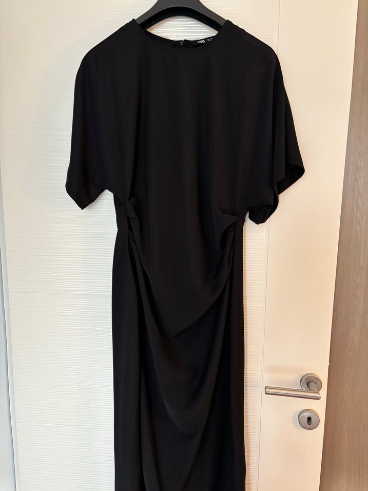 Siyah uzun elbise, kısa kollu ve yuvarlak yakalı, bol kesimdir. İpek gibi dokusuyla drapeli tasarıma sahiptir. Ofis için minimalist ve çağdaş stil. L bedendir.